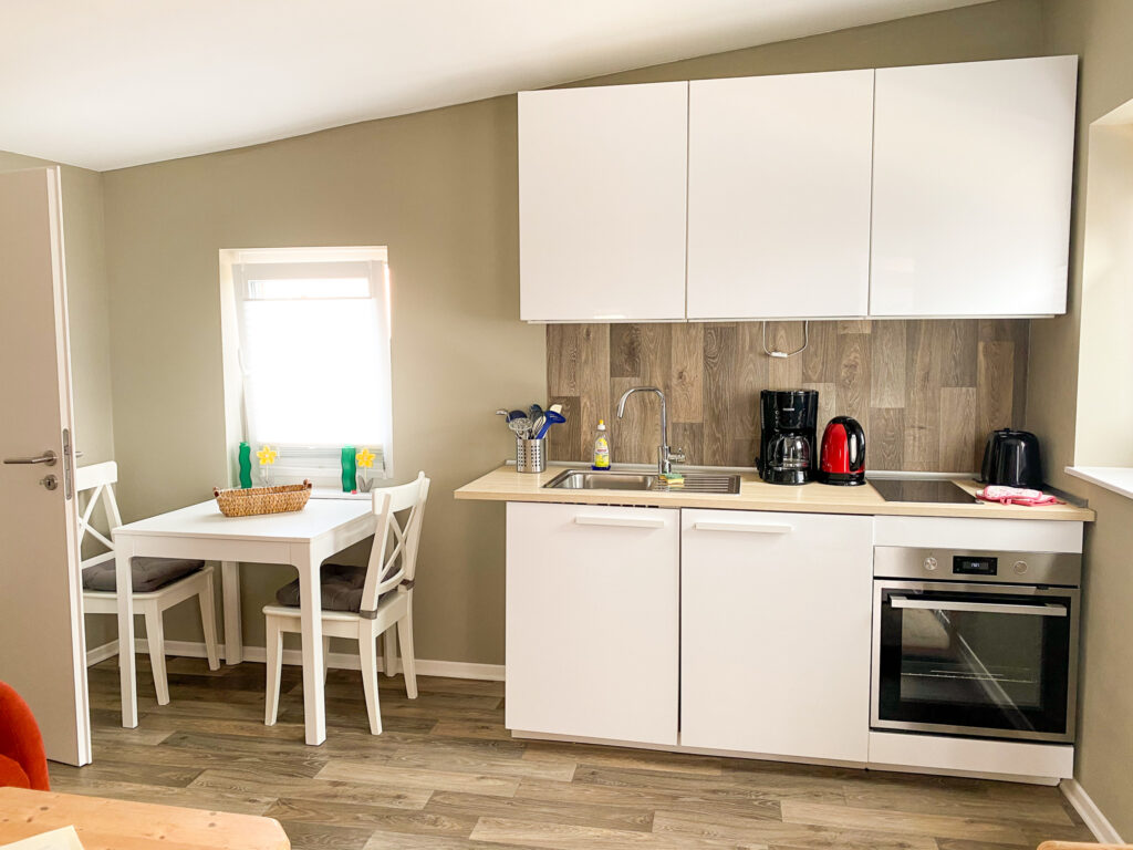Unsere komfortablen Ferienwohnungen sind modern und gemütlich möbliert. Freundliche Farben sorgen für eine Wohlfühl-Atmosphäre, in der man sich gerne aufhält. Jedes Appartement besitzt eine Küche bzw. eine Küchenzeile, die mit allen notwendigen Geräten und Utensilien, wie Herd, Kaffeemaschine oder Mikrowelle, ausgestattet ist. Gemeinschaftswaschmaschine und –trockner können gegen eine geringe Gebühr genutzt werden.